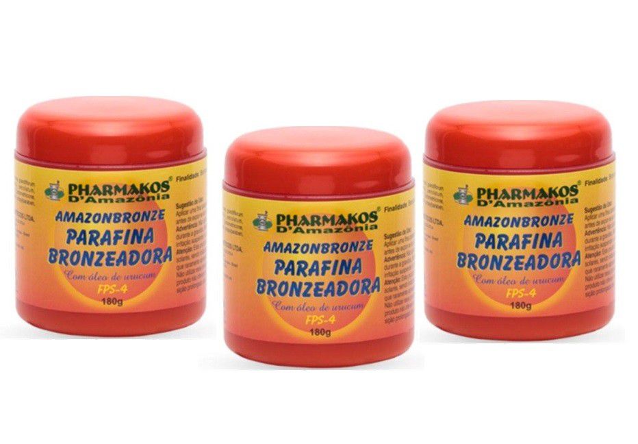 Parafina Bronzeadora pharmakos d'amazonia com óleo de urucum, ajuda o seu bronzeado a ficar uniforme e douradinho, utilizando produto naturais extraídos da Amazônia. Fique com a cor do verão!Verão com Pele dourada e protegida. A única que contém óleo de urucum na fórmula que uniformiza e não mancha seu bronzeado. Dermatologicamente testada. Laboratório Pharmakos da Amazônia. Sugestão de Uso: Aplicar uma fina camada sobre o corpo, espalhando-a levemente antes de se expor ao sol e repetir a aplicação a cada banho. Advertência: Não aplicar na pele irritada ou lesionada.Não utilizar durante a gravidez.Manter fora do alcance de crianças, em caso de irritação suspender o uso do produto.Contém Cânfora.