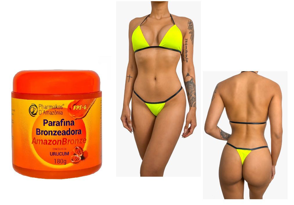 **Brinde Biquini em tecido, marquinha de fita adesiva. Tamanho único serve os números 40 ao 46. Não se arrisque com fita adesiva. Podem causar sérios danos ao seu corpo!